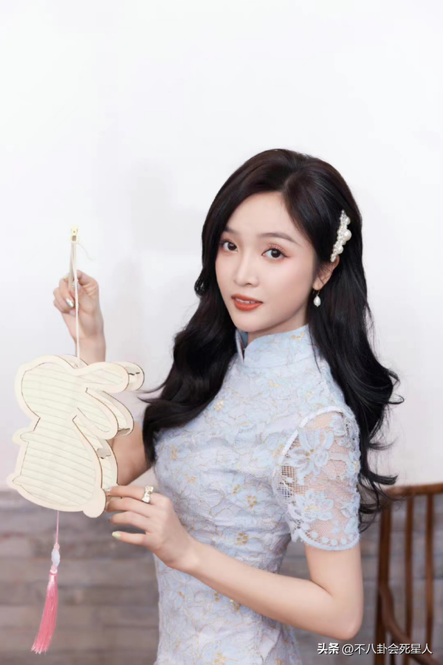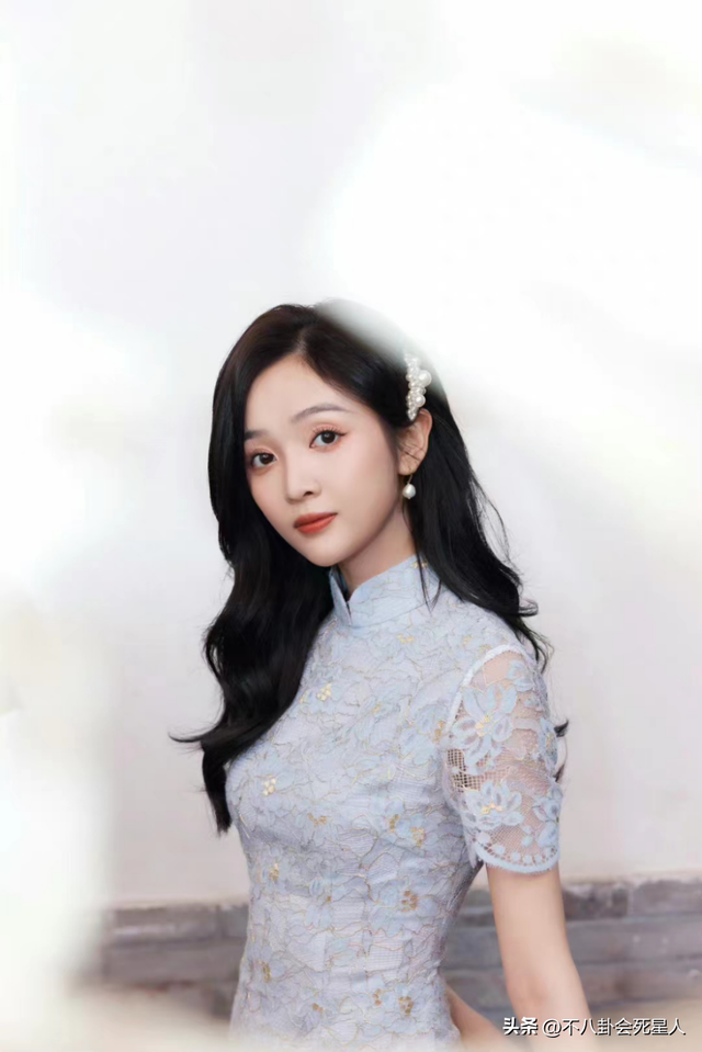 她身穿一件淡蓝色的镂空刺绣旗袍,披散着一头波浪般的长卷发,额边戴着珍珠发卡,透着几分灵秀动人的气质。