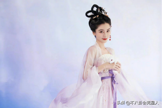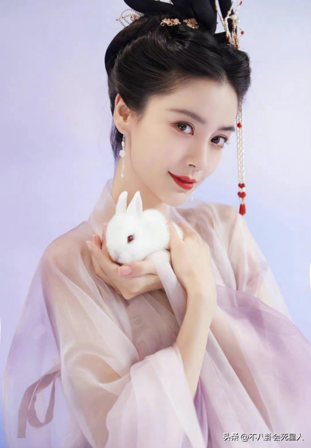 身穿紫色薄纱裙的杨颖,盘着古典端庄的发髻,手上捧着一只可爱的小兔子,看起来既清冷秀丽又娇俏可人。