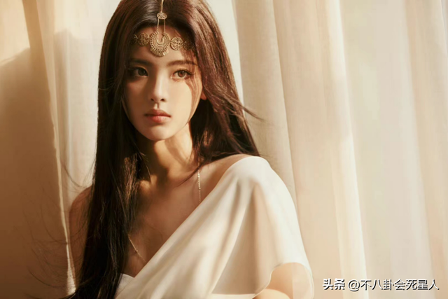 她身穿一件斜肩纯白长裙,留着黑长直的发型,额间搭配了金色的坠饰,散发出高贵迷人的气质。